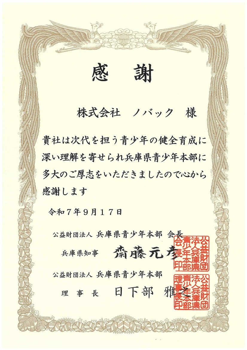 このたび株式会社ノバック(兵庫県姫路市)は、兵庫県青少年本部より、スポーツを通じて子どもたちの心身の健全育成を目的とした